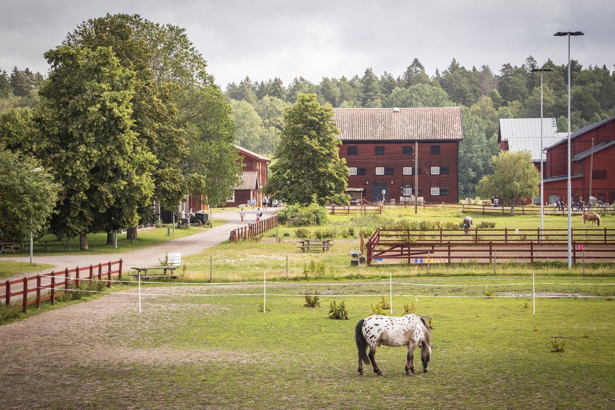 Häst utanför Vallastallet i Valla utanför Linköping.