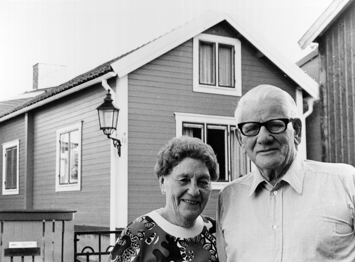 Förre Verkmästaren vid Gefle Porslinsfabrik Sven Nilsson med fru Thora utanför hemmet vidÖvre Bergsgatan 10.