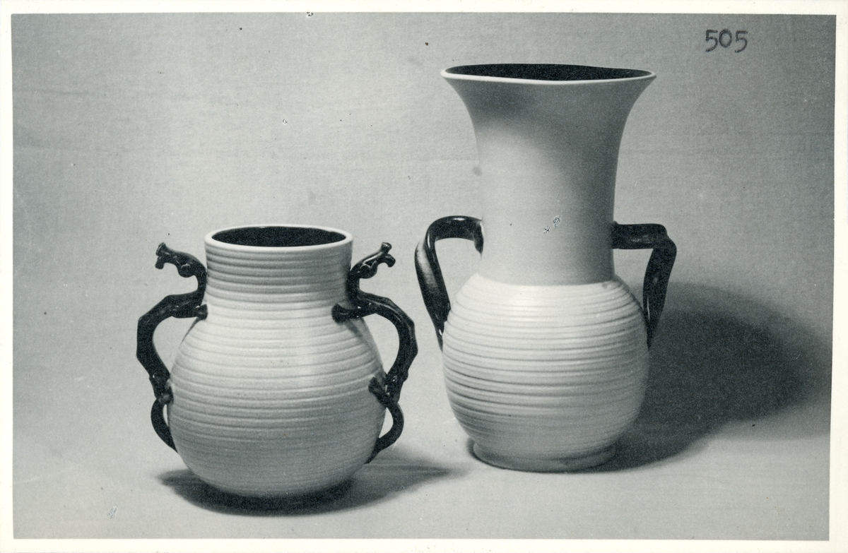 Vas B75 och B79 från Bo Fajans, formgivare Eva Jancke-Björk, 1900-talets mitt. Glasyr 510.