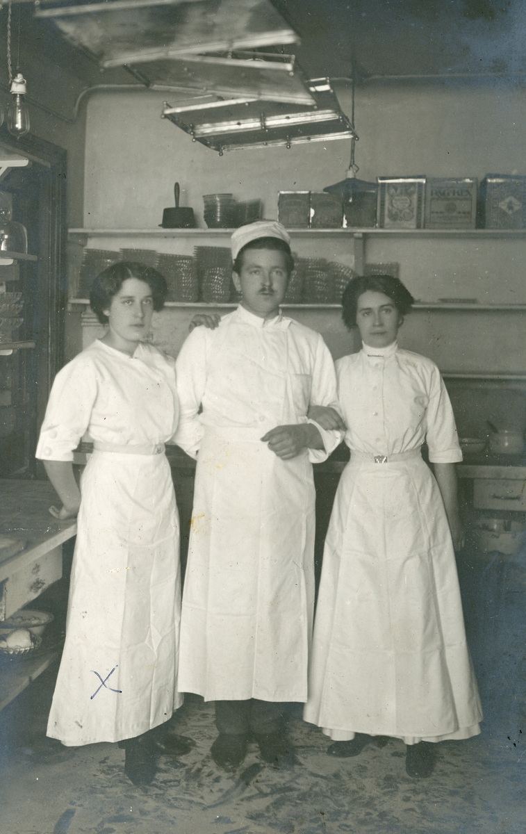 Titel: Foto av konditor Byhlin mellan tvenne eldar? Kvinnan med X markering är kallskänksbiträde blev gift med en rik mans son, var ingenjör (enligt text skriven i albumet).