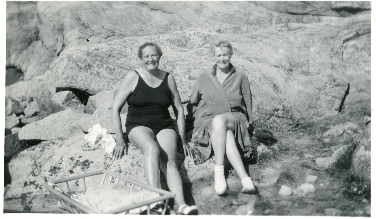 Foto av Tora och Hulda på Smögen 1947 (enligt text skriven i albumet).