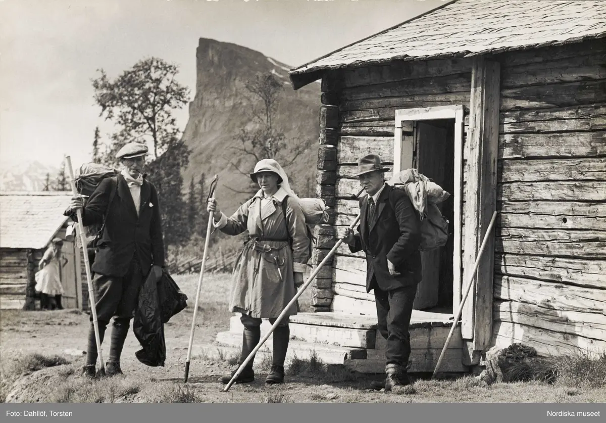 Två män och en kvinna klädda för fjällvandring. Packade ryggsäckar, vandringsstavar. De står vid trappan till en stuga. Fjälltopp i bakgrunden. Sommar.
