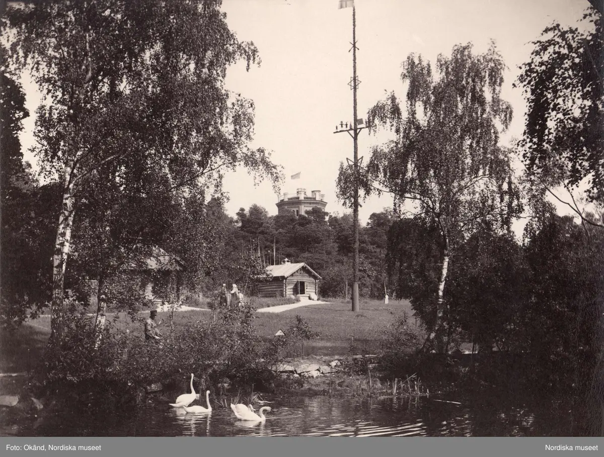 Vy från Skansen med svanar, midsommarstång och i bakgrunden Bredablick.