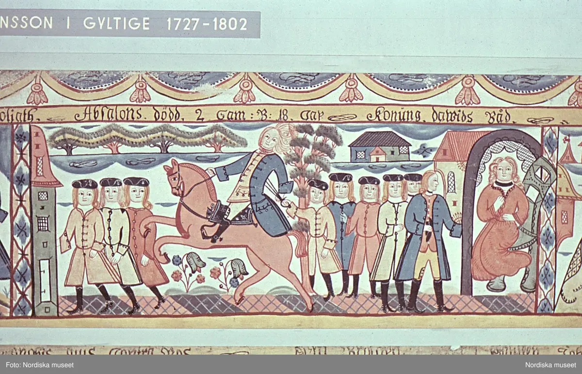 Del av målad gavelbonad med Absaloms död och Konung Dawids båd av Nils Svensson från 1727-1802, Halland. Nordiska museets föremål invnr. NM.0053442