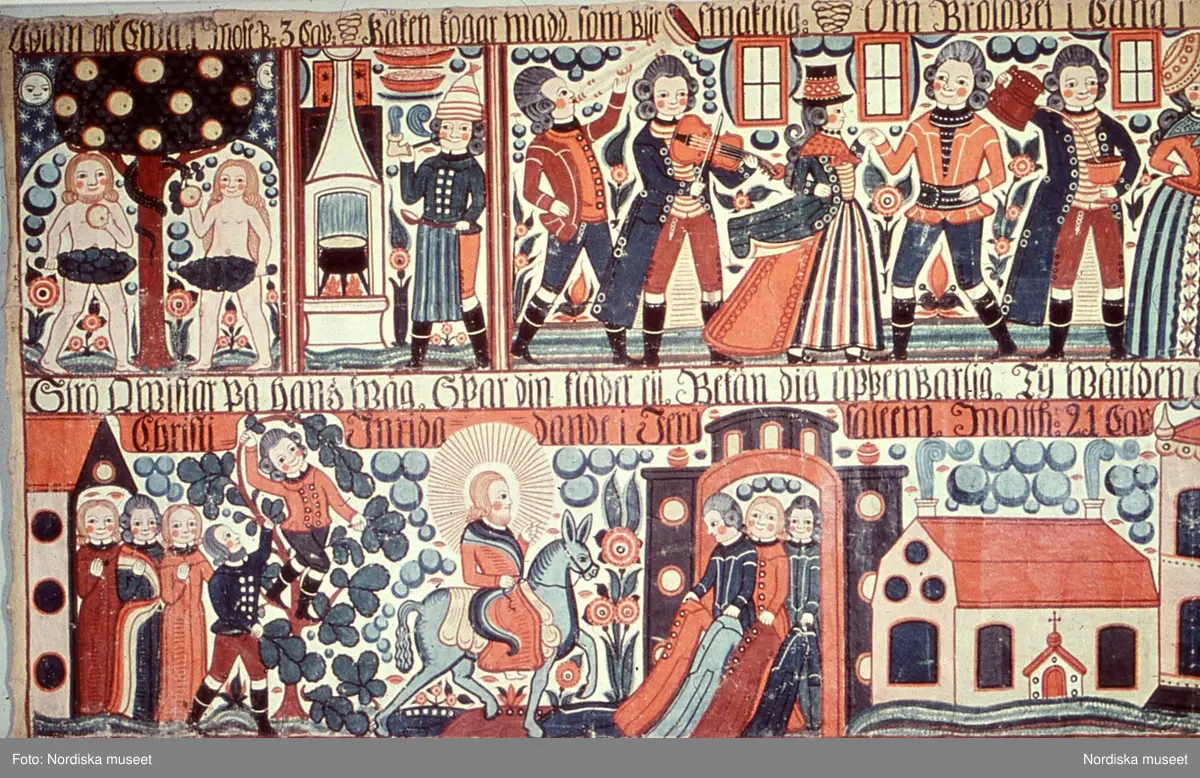 Del av målad väggbonad med Bröllopet i Kana, Adam och Eva, Jesu inridande i Jerusalem av Johannes Nilsson från 1757-1827, Halland. Nordiska museets föremål invnr. NM.0060883