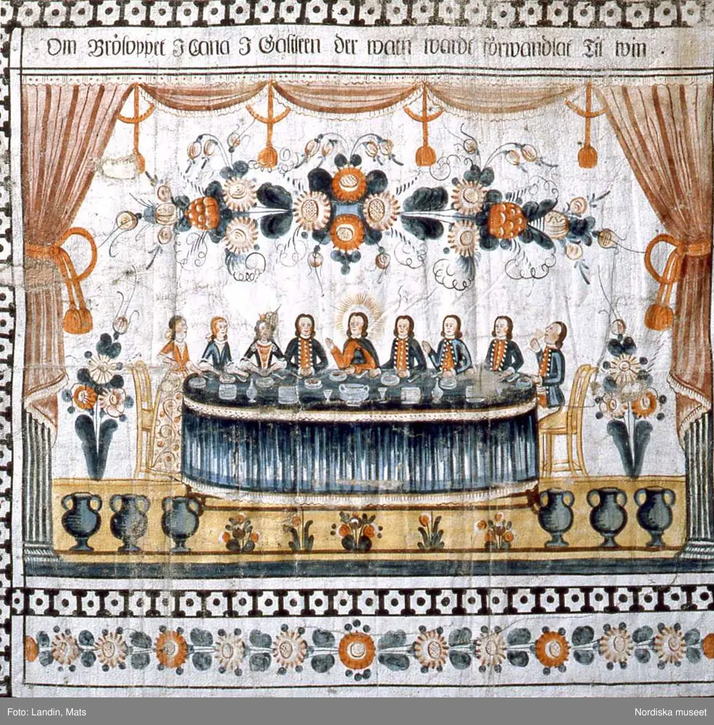 Målad bonad, dalmålning med Bröllopet i Kana av Winter Carl Hansson från 1777-1805. Nordiska museets föremål NM.0208656