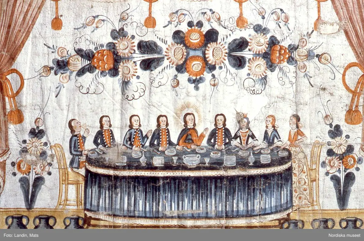 Detalj Målad bonad, dalmålning med Bröllopet i Kana av Winter Carl Hansson från 1777-1805. Nordiska museets föremål NM.0208656