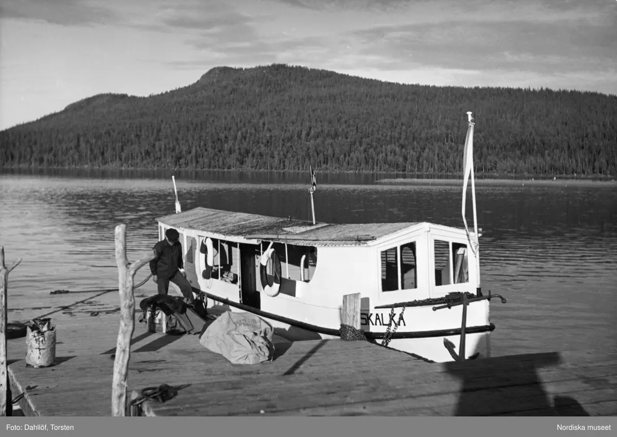 Kvikkjokksleden: "Skalka" vid bryggan i Njavve vid sjön Skalkas västra ände. Båten går mellan Björkholmen och Njavve, där man på en mårka färdas till Saggat