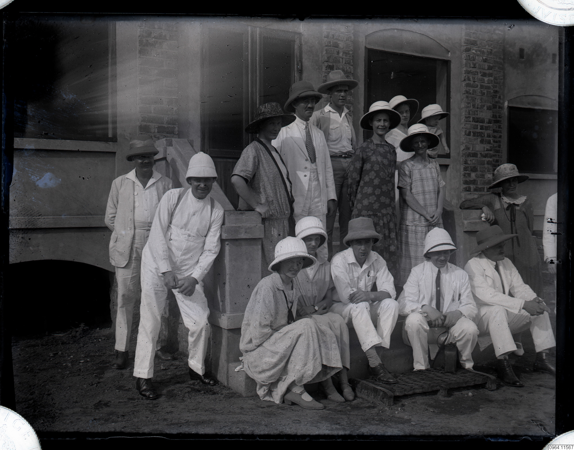 Missionärer på trappa framför byggnad. Industriskolans lärarebostad. M.E.S. Mansimou. S.M.F. Jämför 0964.d.2025.