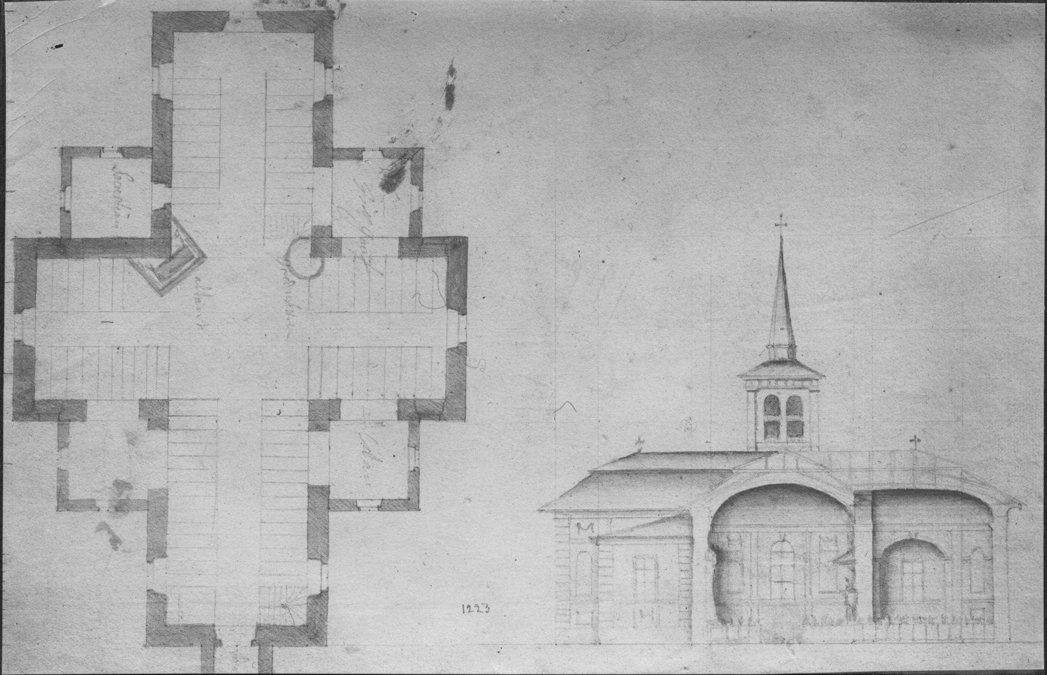 Planritning och fasadritning över kyrkan. Original i Tessinsamlingen Nationalmuseum. Tillskriven Jean de la Vallée.