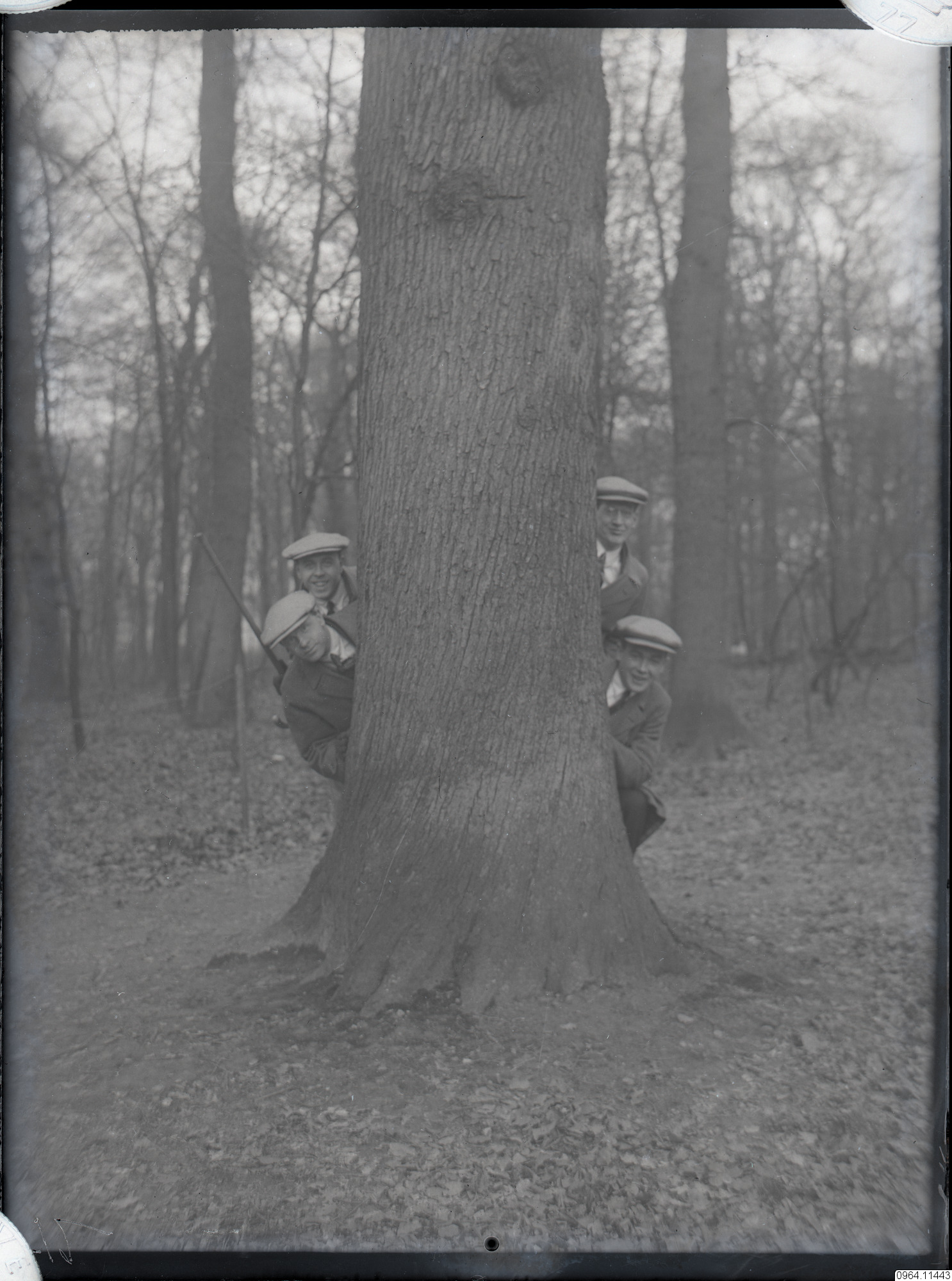Fyra män i keps och med gevär bakom träd.