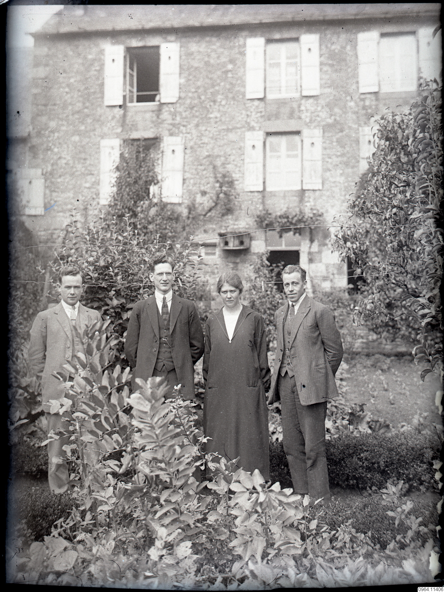 Tre män och en kvinna framför trevåningshus. Möjligen är en av dem Gustaf Samuel Jakobsson? Möjligen bild från utbildning/kurstillfälle för missionärer i Europa?