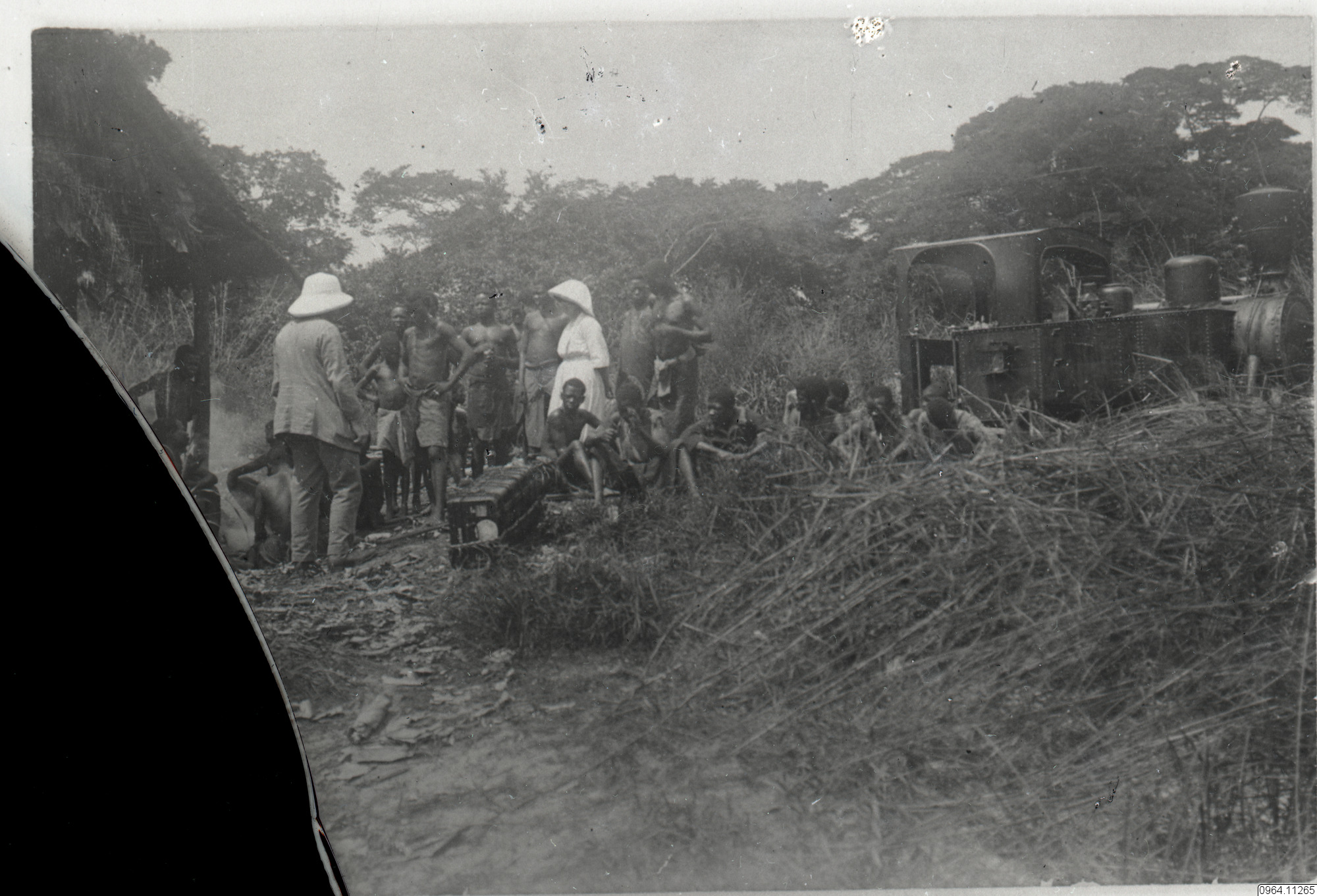 Missionärer och kongoleser. Ett tåglok (?) syns till höger.