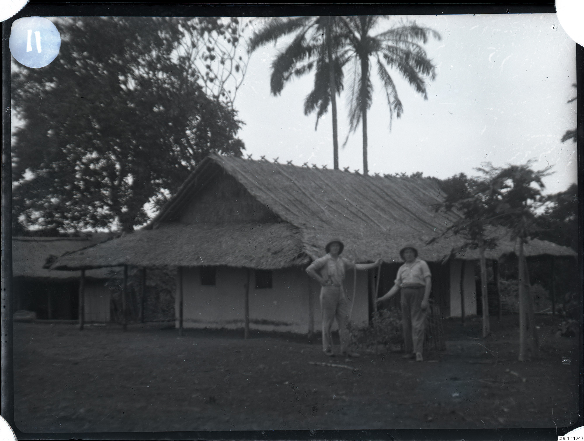 Två missionärer utanför hus.