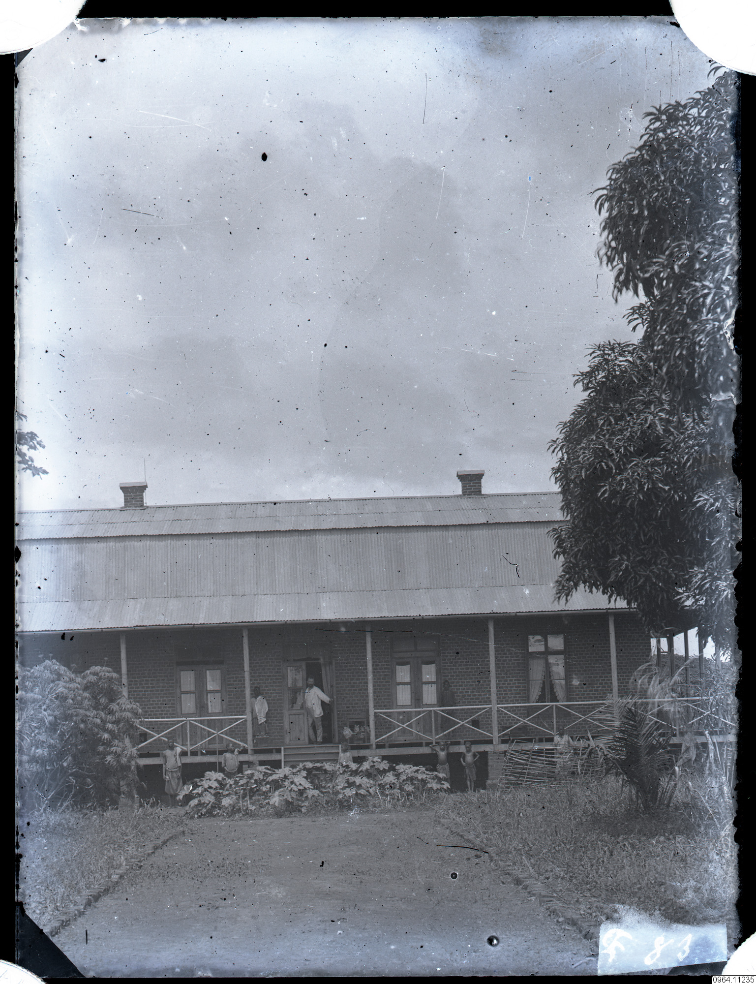 Stationshus/boningshus, Kibunzi med missionärer utanför. Nyligen taget efter bygget vilket syns på det provisoriska staketet runt verandan. Två skorstenar.