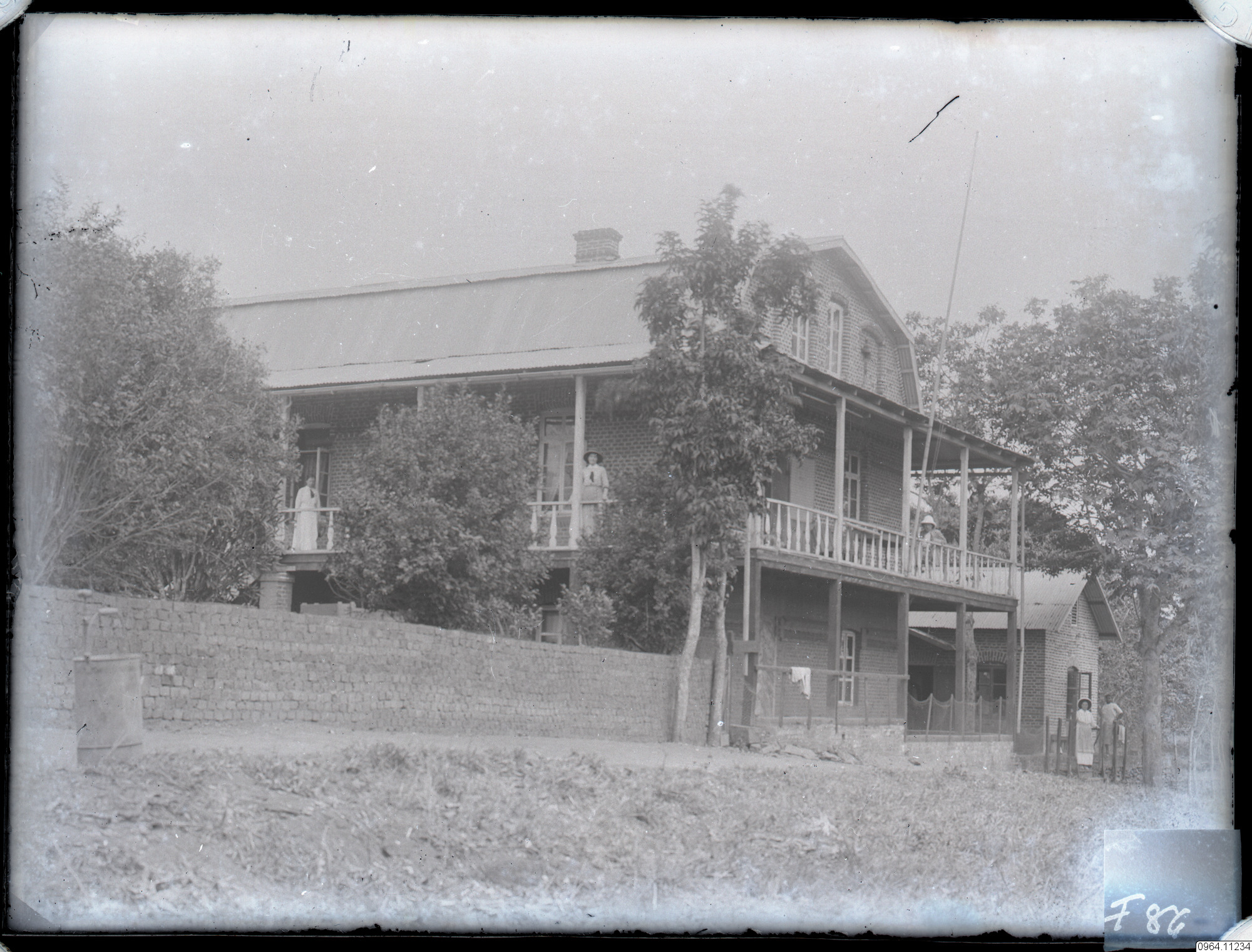 Boningshus/stationshus två våningar med skorsten. Är det Kingoyi? Staketet ser ut som Kibunzi men det huset hade väl aldrig två våningar? En mur ansluter och bredvid ett mindre hus.