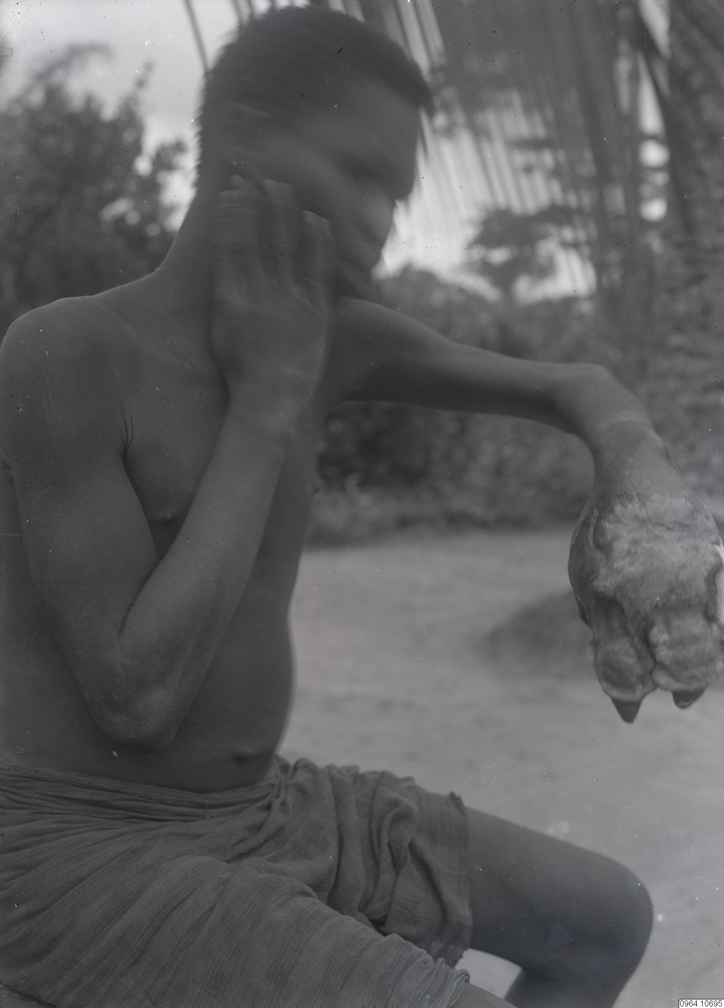 Pojke visar upp armen och handen med skada. Sjukvård i Kongo. Ormbett?