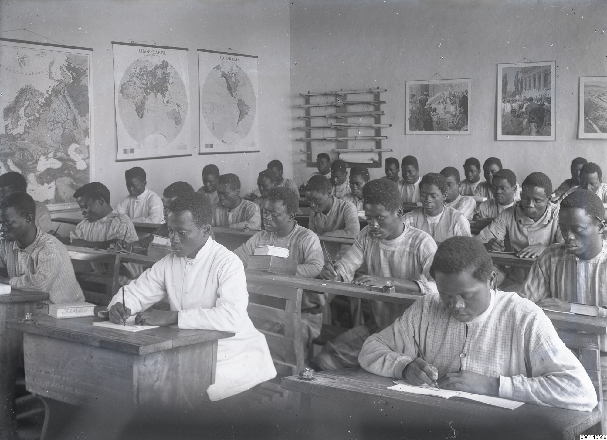 Skolsal/klassrum med elever i skolbänkar som sitter och skriver. På väggarna bland annat kartor.