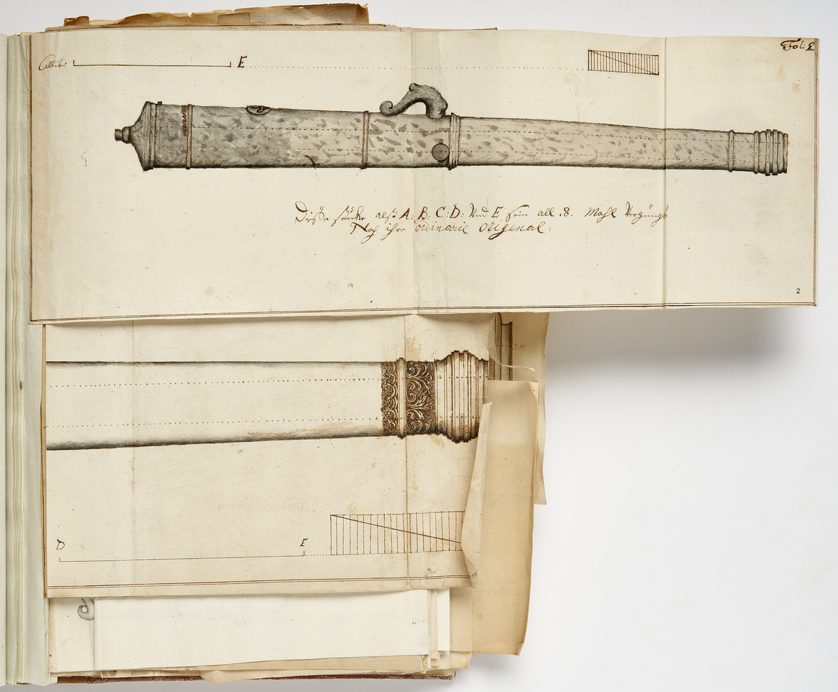 Titel: Avbildning av eldrör från fästningen i Narva, ur en volym som dokumenterar artilleritroféer i fästningarna i Ingermanland och Kexholm, daterad 1691.