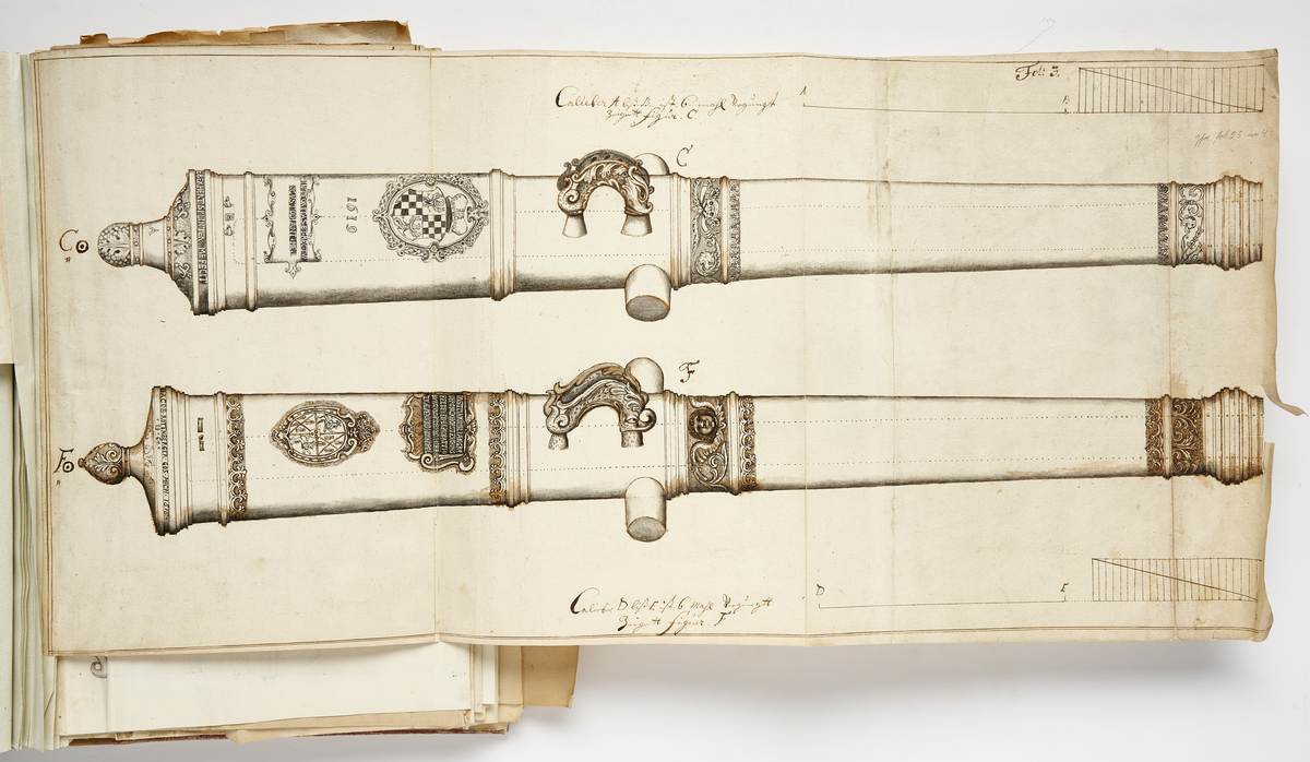 Avbildning av eldrör från fästningen i Narva, ur en volym som dokumenterar artilleritroféer i fästningarna i Ingermanland och Kexholm, daterad 1691.