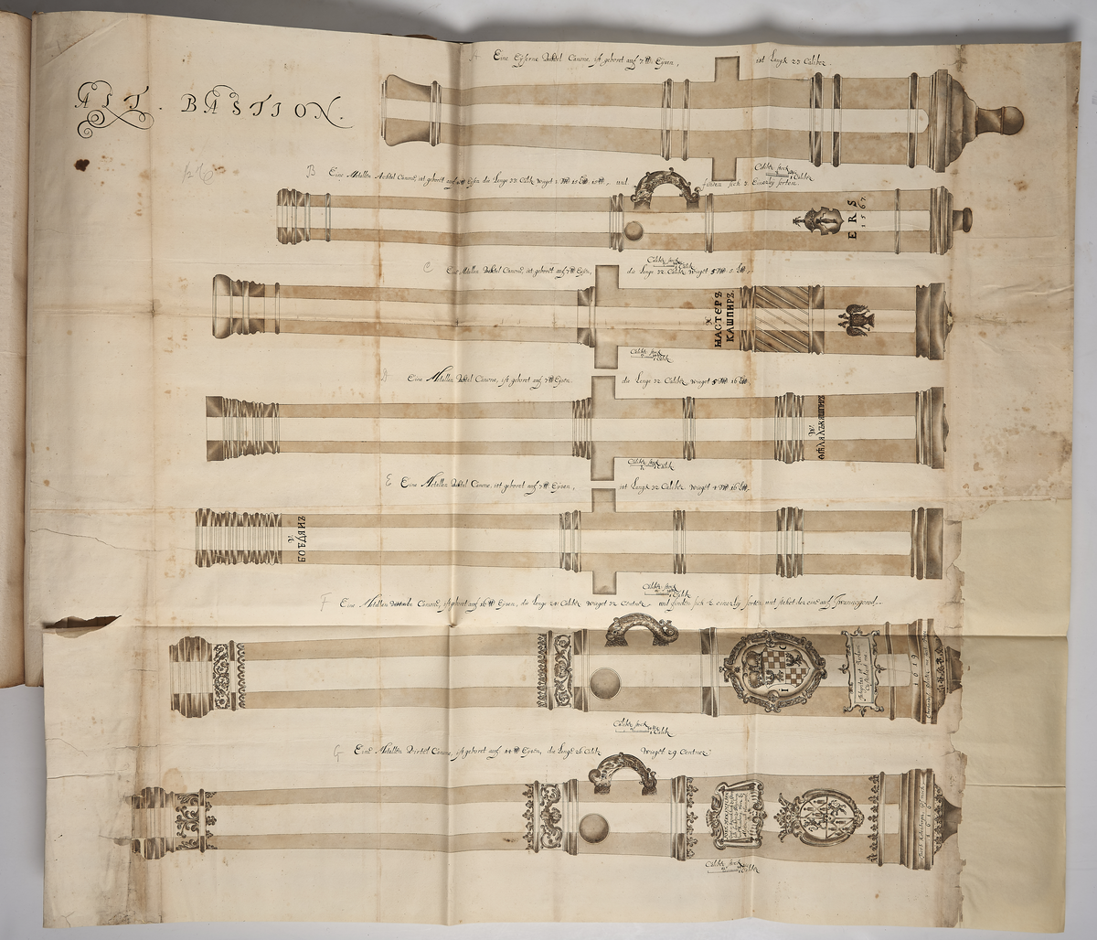 Titel: Avbildning av eldrör ur en inventering av artilleribestyckningen vid fästningarna i Ingermanland: Narva, Iwanogorod, Nyen, Nöteborg och Kexholm. Sammanställd 16701671.