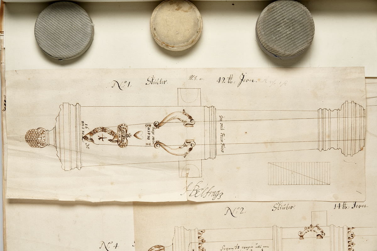 Avbildning av ett 42-pundigt eldrör ur en inventeringsvolym som dokumenterar artilleribestyckningen vid fästningarna i Göteborg, Älvsborg, Marstrand och Bohus. Inventeringen sammanställdes den 26 mars 1691.