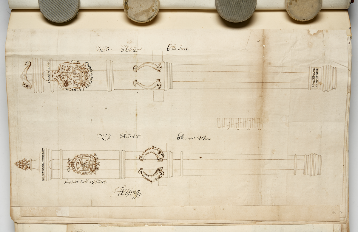 Avbildning av två 6-pundiga eldrör ur en inventeringsvolym som dokumenterar artilleribestyckningen vid fästningarna i Göteborg, Älvsborg, Marstrand och Bohus. Inventeringen sammanställdes den 26 mars 1691.