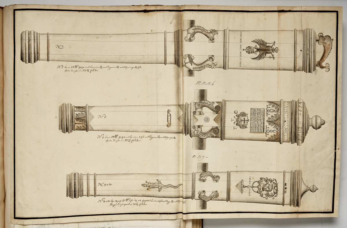 Avbildning av tre 21-pundiga eldrör ur en inventeringsvolym som dokumenterar artilleribestyckningen vid fästningarna i Göteborg, Älvsborg, Marstrand och Bohus. Inventeringen sammanställdes den 26 mars 1691.