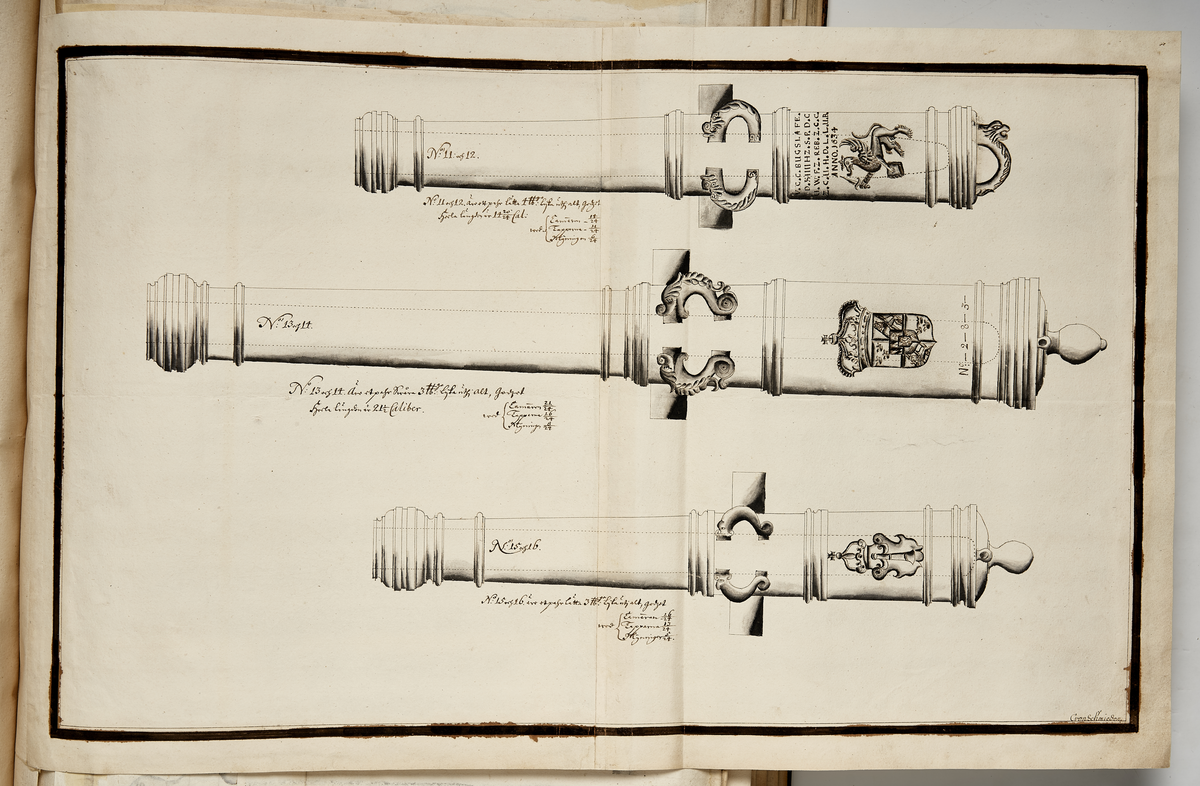 Avbildning av två 3-pundiga och ett 4-pundigt eldrör ur en inventeringsvolym som dokumenterar artilleribestyckningen vid fästningarna i Göteborg, Älvsborg, Marstrand och Bohus. Inventeringen sammanställdes den 26 mars 1691.
