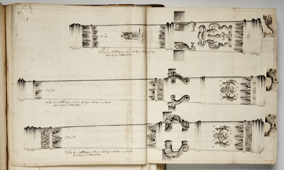 Avbildning av ett 24-pundigt, ett 23-pundigt och ett 18-pundigt eldrör ur en inventeringsvolym som dokumenterar artilleribestyckningen vid fästningarna i Göteborg, Älvsborg, Marstrand och Bohus. Inventeringen sammanställdes den 26 mars 1691.
