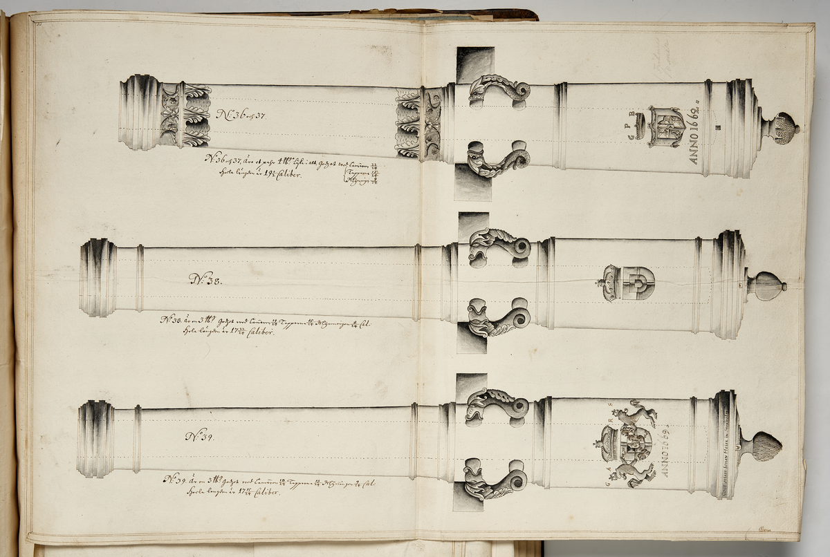 Avbildning av ett 4-pundigt och två 3-pundiga eldrör ur en inventeringsvolym som dokumenterar artilleribestyckningen vid fästningarna i Göteborg, Älvsborg, Marstrand och Bohus. Inventeringen sammanställdes den 26 mars 1691.