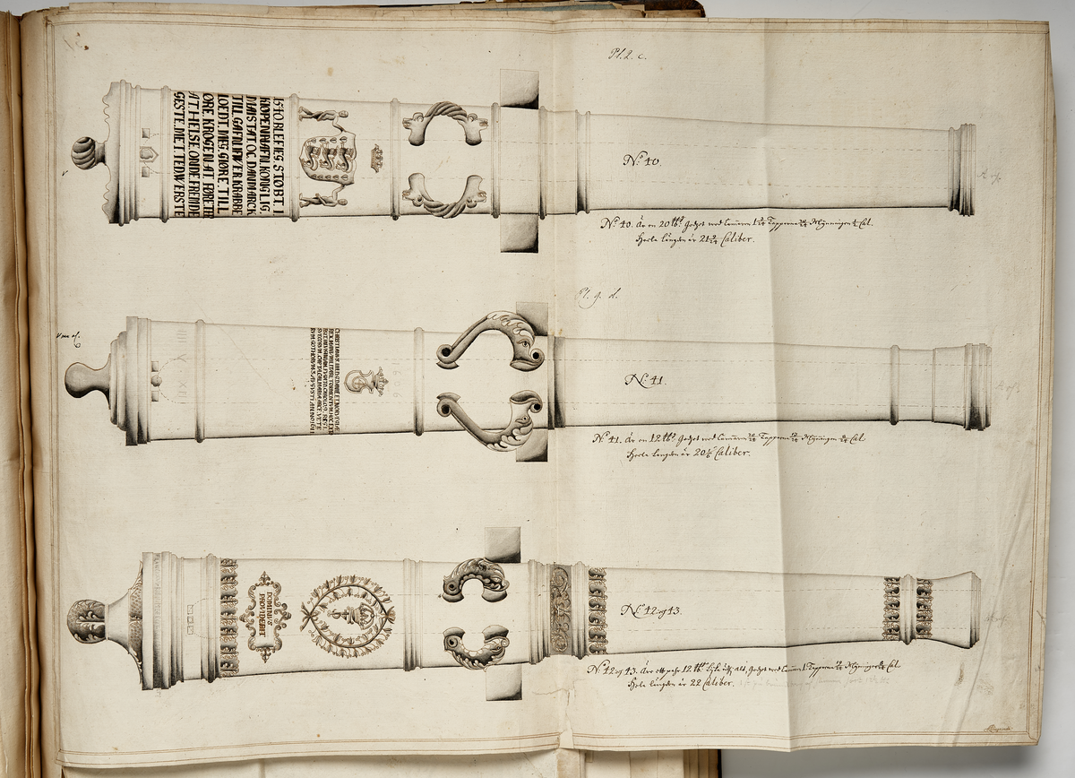 Avbildning av ett 20-pundigt och ett 12-pundiga eldrör ur en inventeringsvolym som dokumenterar artilleribestyckningen vid fästningarna i Göteborg, Älvsborg, Marstrand och Bohus. Inventeringen sammanställdes den 26 mars 1691.