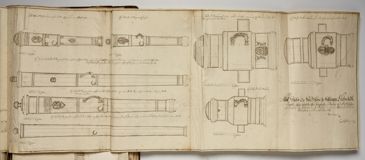 Avbildning av eldrör vid Halmstads fästning ur en inventeringsvolym som dokumenterar artilleribestyckningen vid fästningarna i Göteborg, Älvsborg, Marstrand och Bohus. Inventeringen sammanställdes den 26 mars 1691.