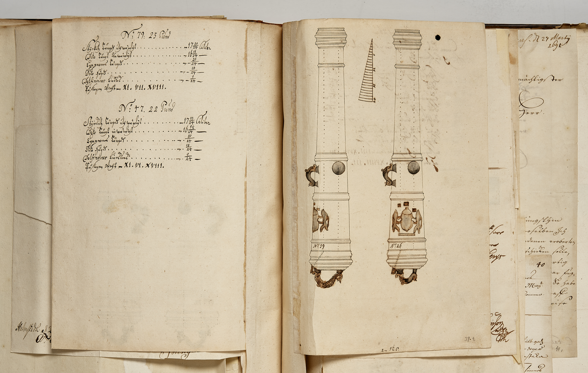 Avbildning av eldrör ur en inventeringsvolym som dokumenterar artilleribestyckningen vid fästningarna i Göteborg, Älvsborg, Marstrand och Bohus. Inventeringen sammanställdes den 26 mars 1691.