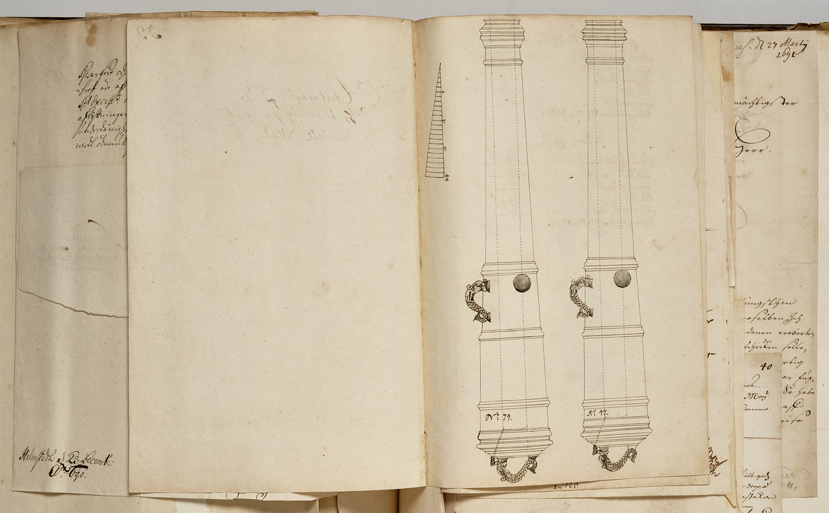 Avbildning av eldrör ur en inventeringsvolym som dokumenterar artilleribestyckningen vid fästningarna i Göteborg, Älvsborg, Marstrand och Bohus. Inventeringen sammanställdes den 26 mars 1691.