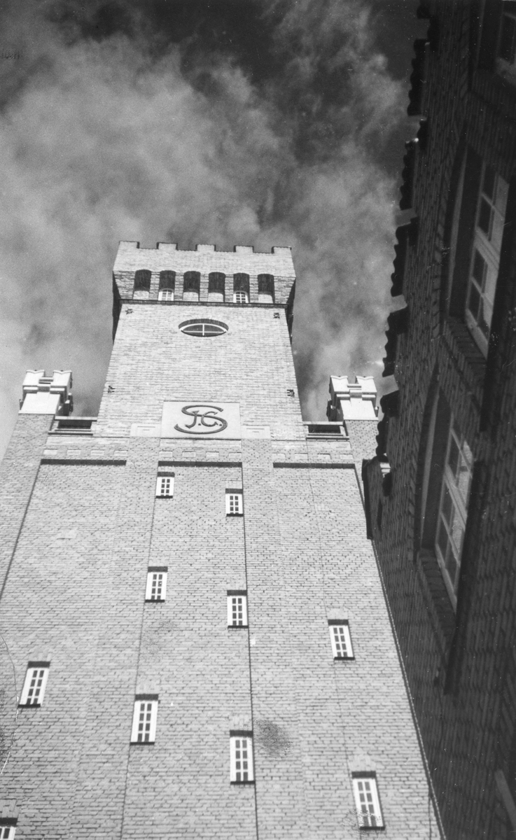 Det pampiga mittornet till Djurö kvarn vid Bråviken väster om Norrköping. Kvarnanläggningen började byggas 1910 genom byggherren Pehr Swartz önskemål om en etablering i området. På platsen uppfördes även ett antal arbetar- och tjänstemannabostäder, vilka tillsammans med gemensamma anläggningar skapade ett mindre samhälle. Odaterat foto.