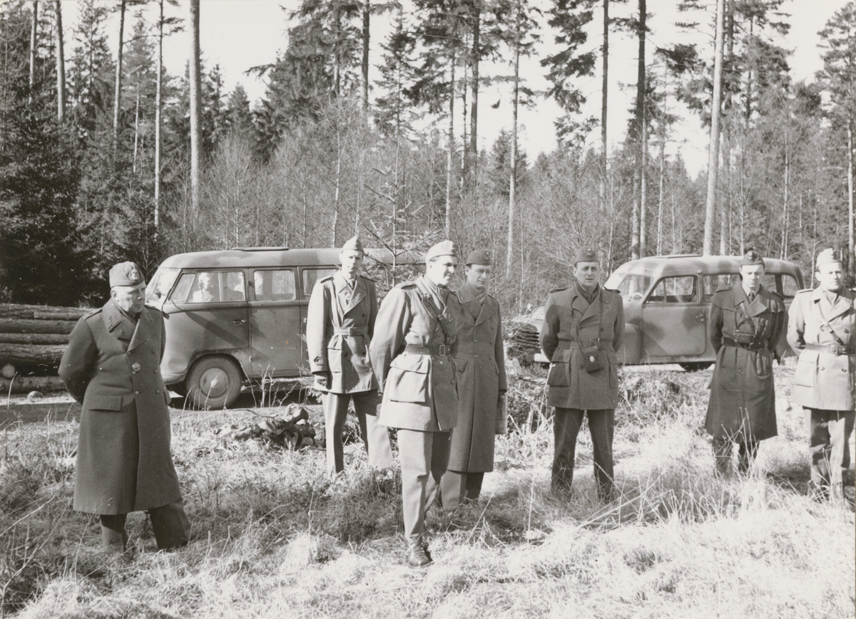 Män vid skogsväg med VW-buss och Volvo Duett i kamouflagemålning, Intendenturfältövning Sunne, 1955.