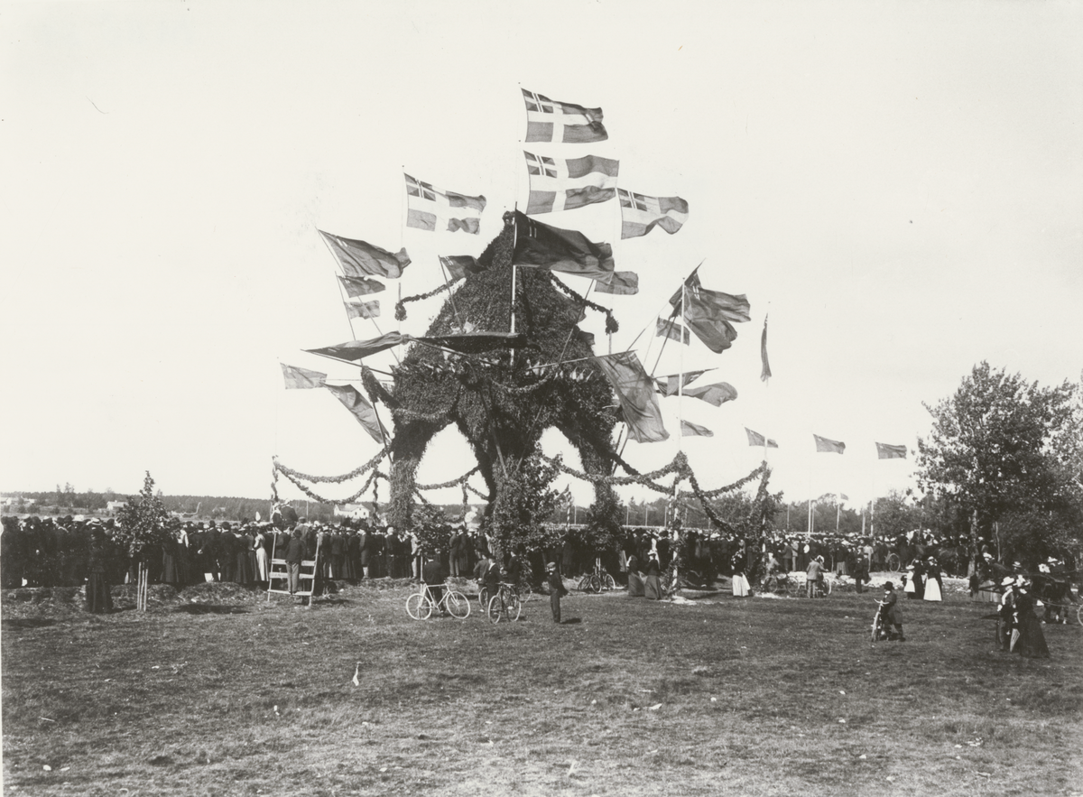 Oscar II anländer till Sanna hed, lövad triumfbåge med unionsfanor och åskådare.