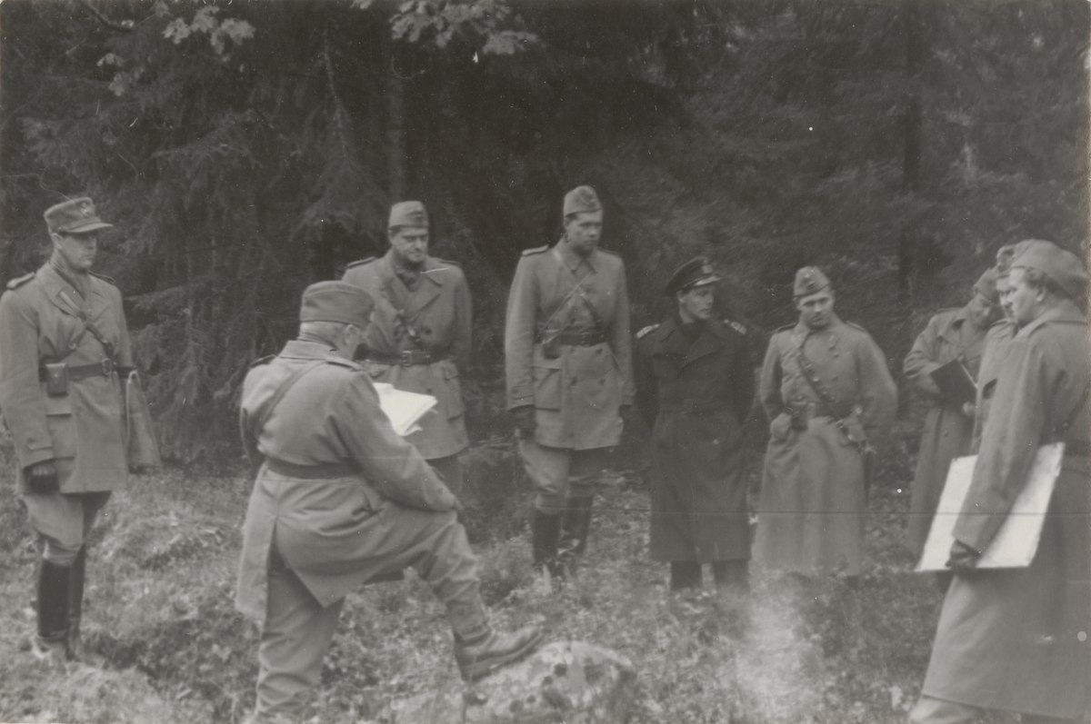 Titel: Män studerar kartor i skog, Intendenturfältövning Sunne, 1955.