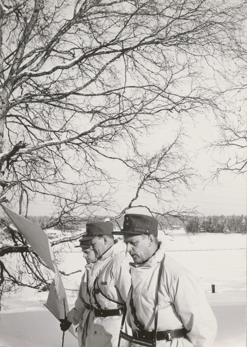 Tre män på skidor, Intendenturfältövning Korpolombolo, vinter 1958.