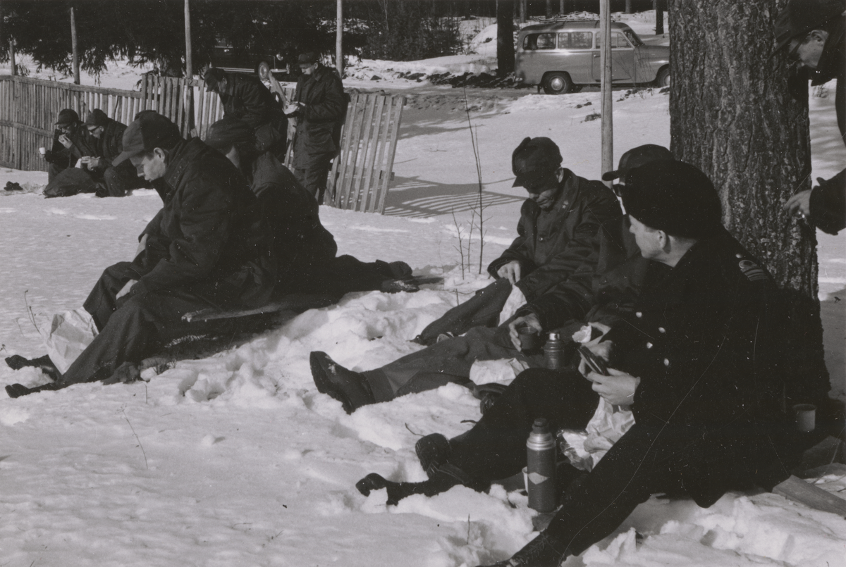 Kaffepaus vid väg med Volvo Duett i bakgrunden, 1960-tal.