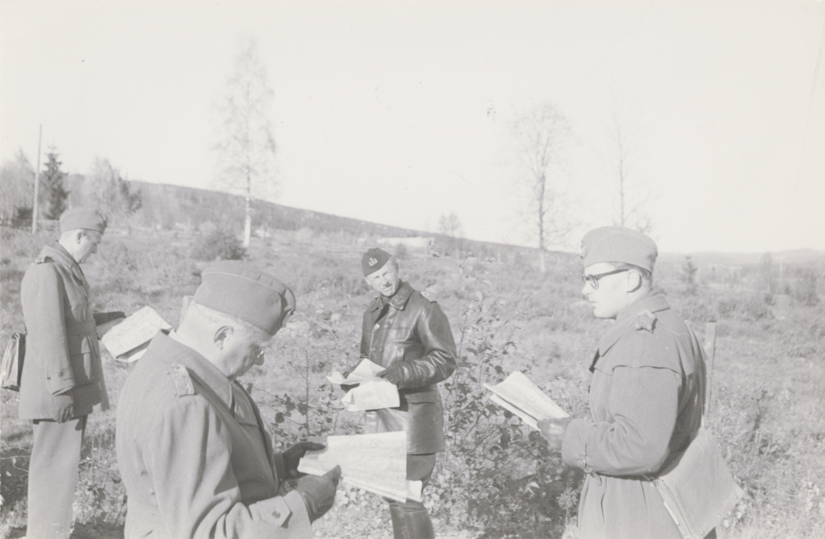 Män studerar kartor i skog, Intendenturfältövning Sunne, 1956.