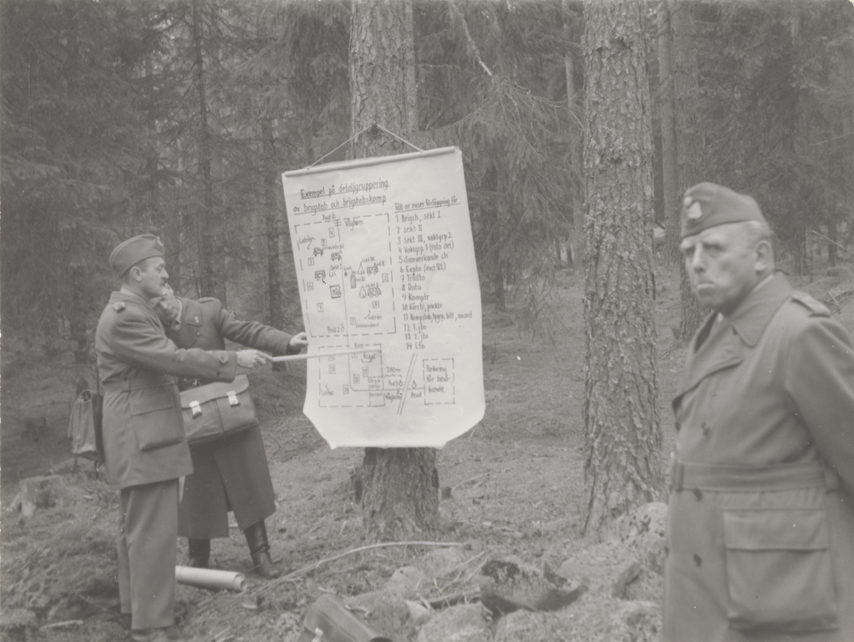 Exempel på grupperingsplan på plansch i skogen, Intendenturfältövning Sunne, 1956.