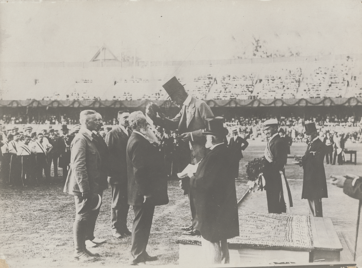Titel: Kung Gustaf V belönar O. G. Swahn på idrottsarena.