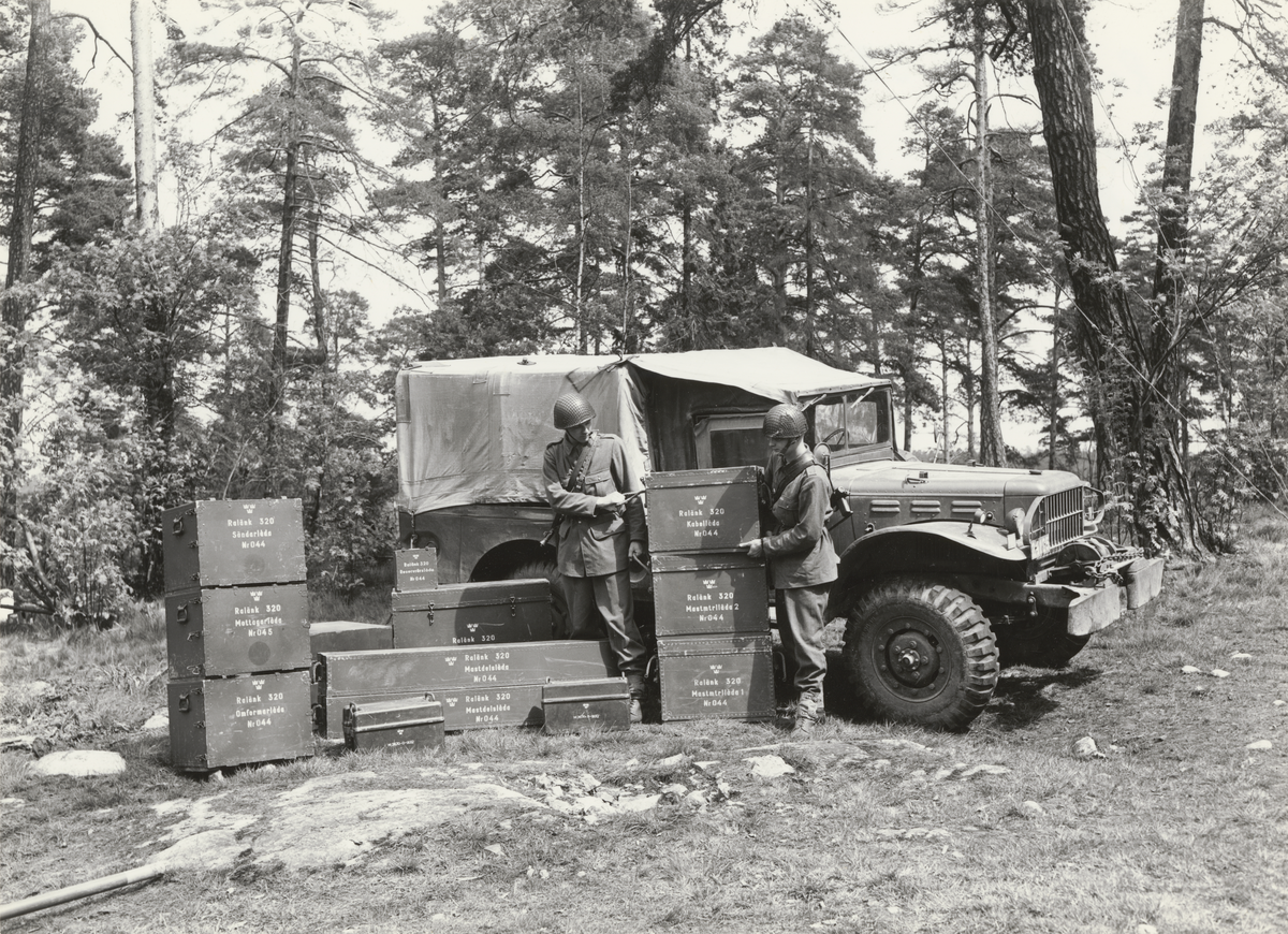 Titel: Två män med lådor till Radiolänk 320 vid militär truck.