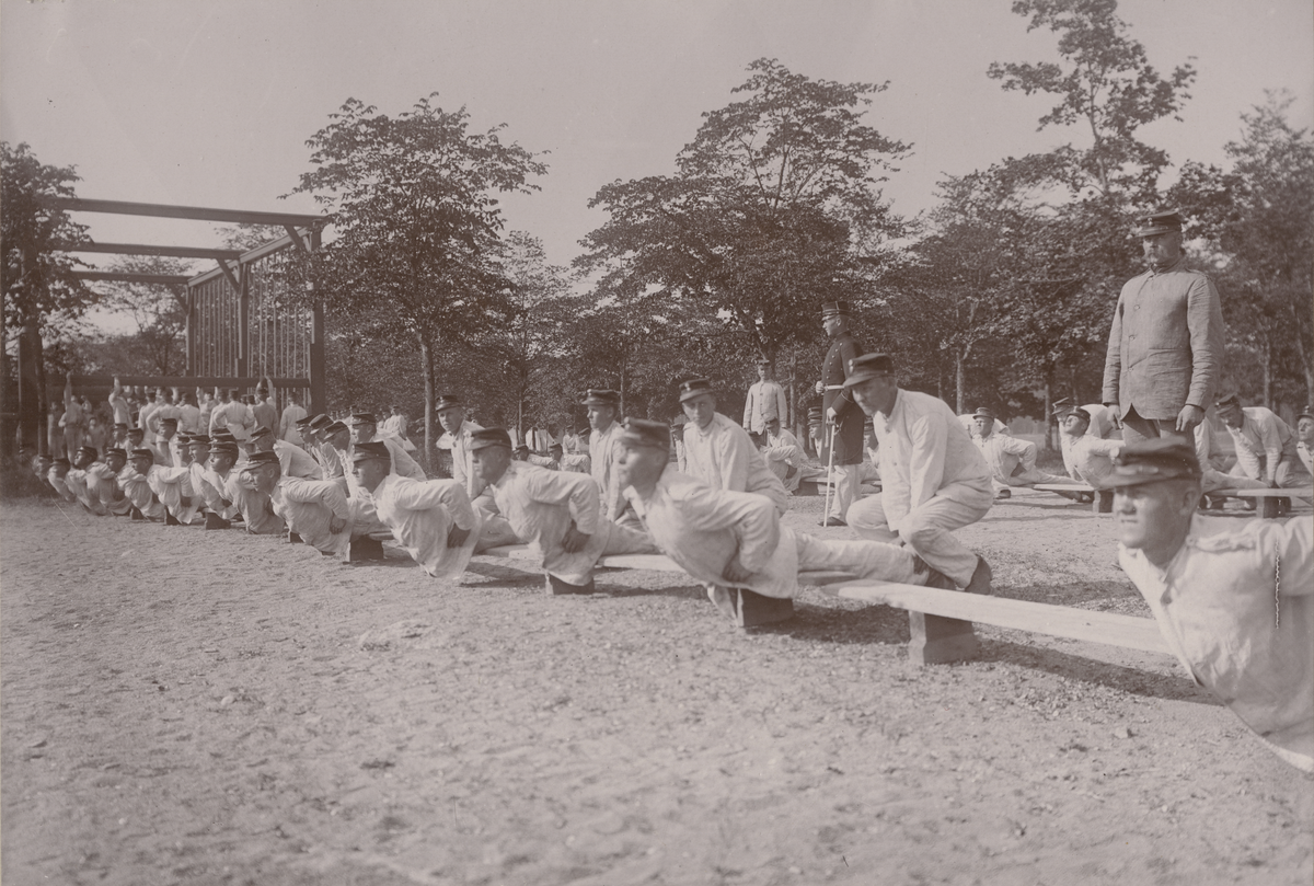 Soldater tränar på bänkar på Polacksbacken, Uppsala övningsområde.