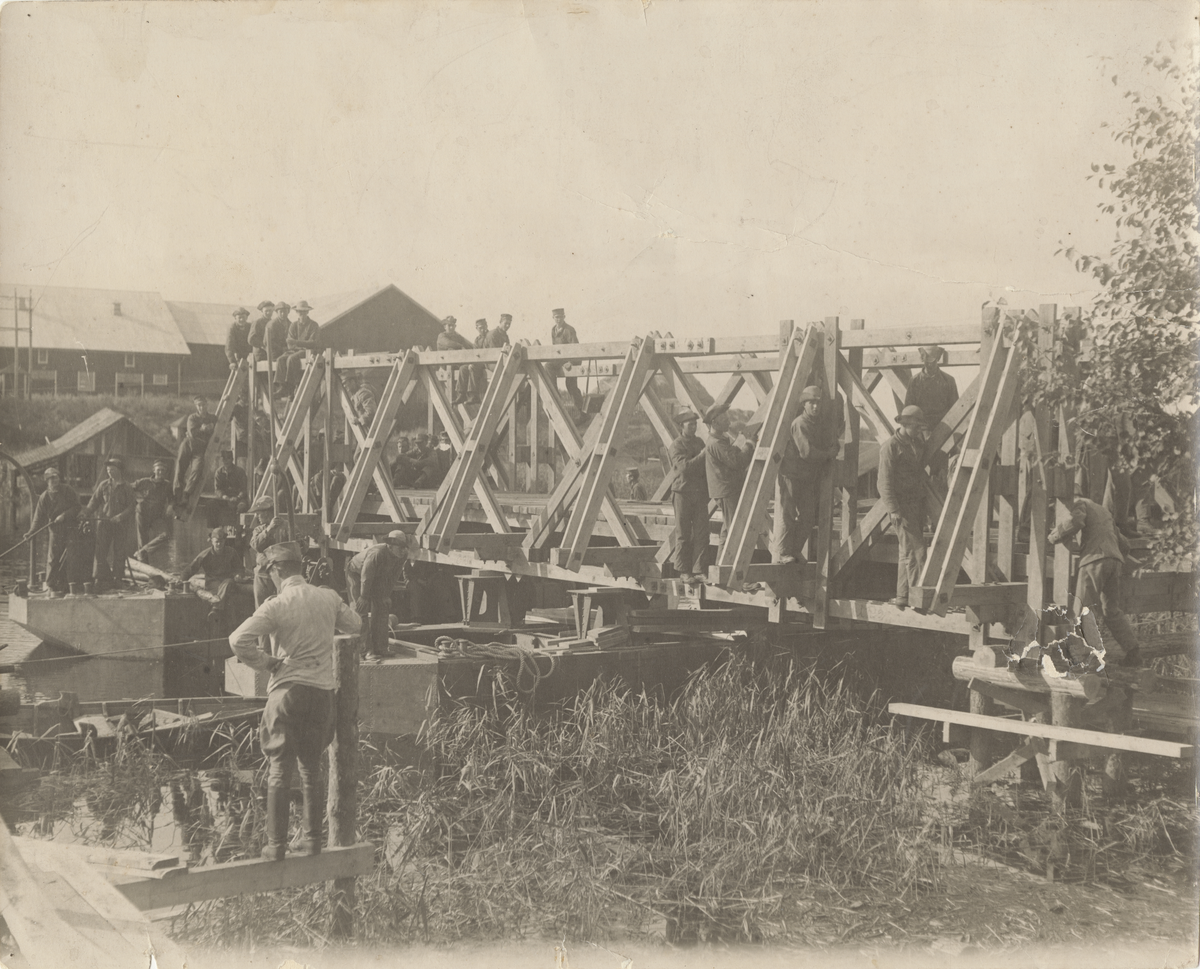 Titel: Ingenjörstrupper bygger pontonbro över å.