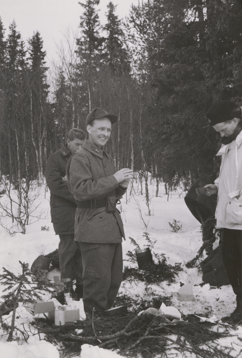 Kaffepaus vid lägereld, vinterfältövning 1960-tal.