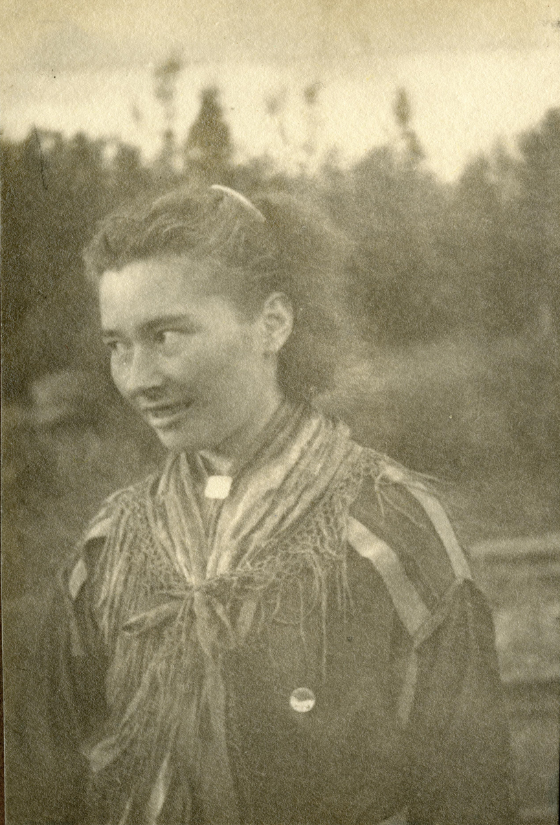 Titel: Porträtt av en samisk kvinna i traditionell dräkt.