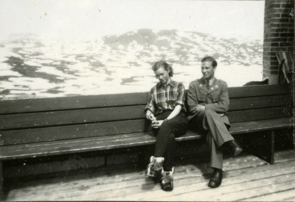 Titel: En soldat och en kvinna sitter på en bänk med fjällandskap i bakgrunden.